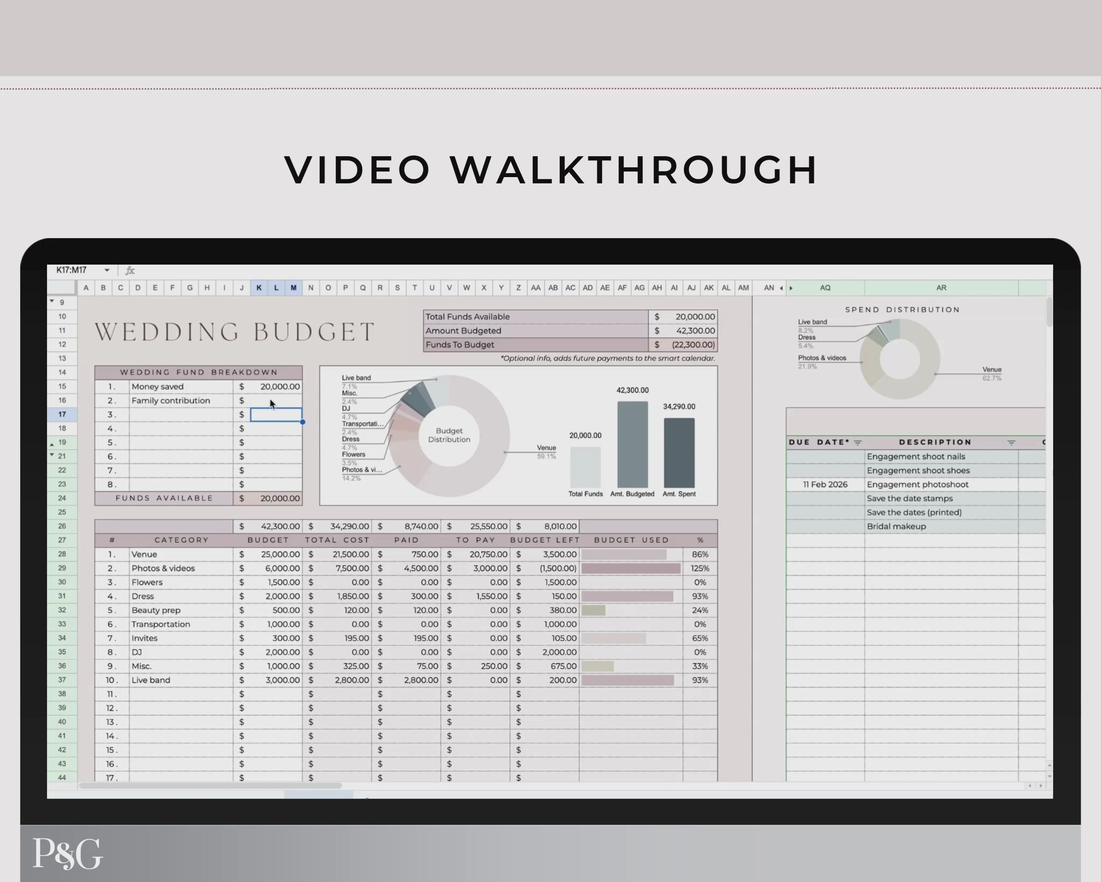 This detailed wedding budget template will help you to map out your wedding budget and track your costs and spending. Equipped with automated charts and data, this Google Sheets wedding budget spreadsheet is great for cost tracking and planning a wedding on a budget!